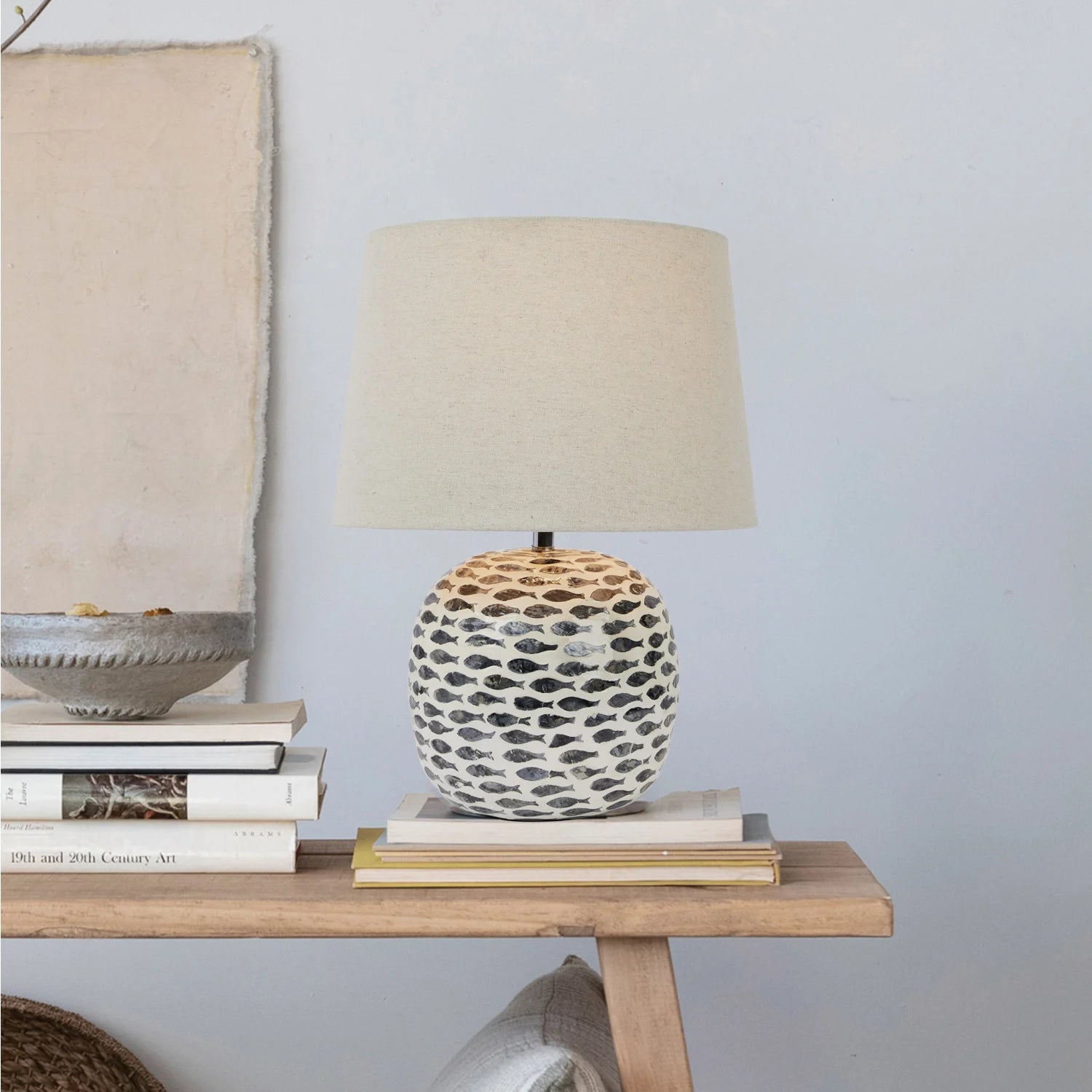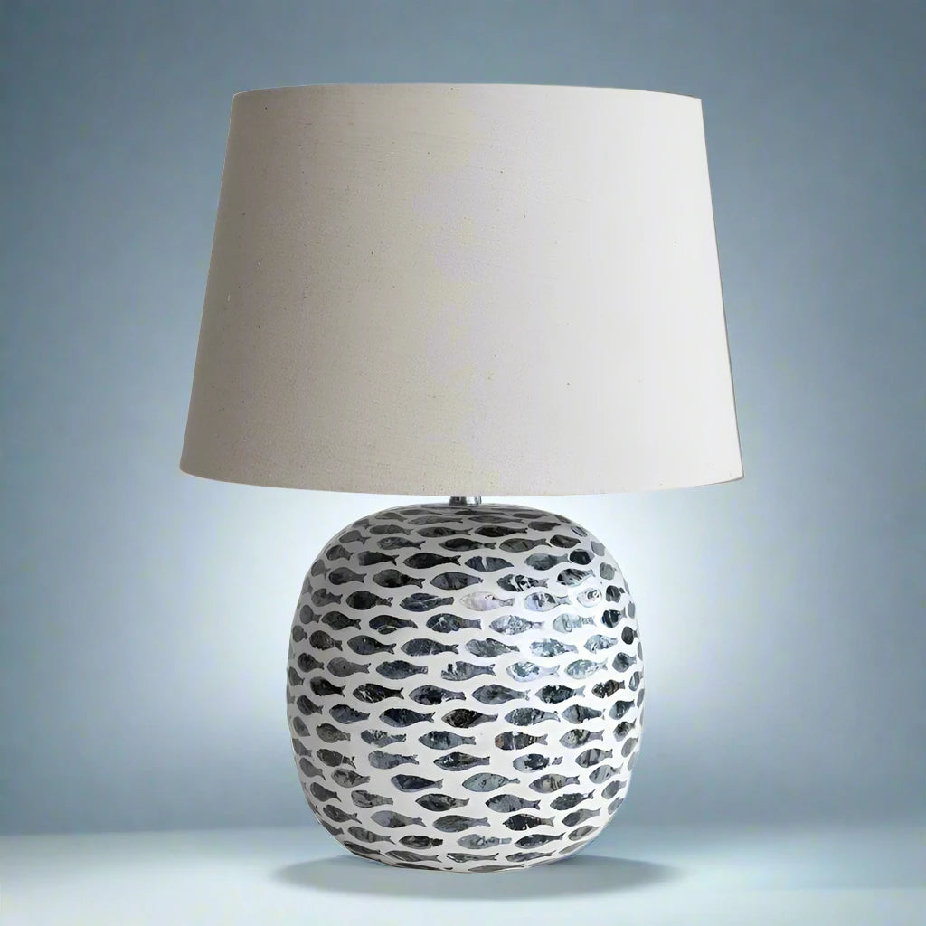 Bring a splash of seaside charm to your space with this fish-patterned table lamp. Featuring an intricate capiz fish design on a bamboo base, it’s a nautical nod to ocean-inspired décor. Topped with a crisp white linen shade, this lamp casts a warm, inviting glow—perfect for cozy evenings by the shore (or just dreaming of one). Maximum 60W bulb not included.