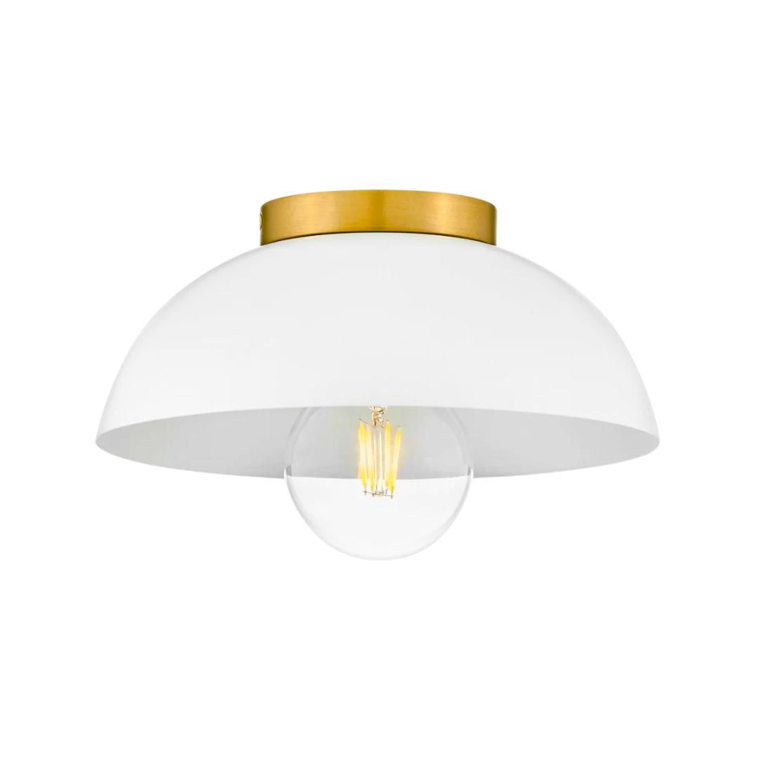 Give your ceiling a chic makeover with the Retro Revival Matte Flush Mount. Embracing a playful blend of vintage charm and modern elegance, this fixture features a matte white finish paired with a striking Lacquered Brass canopy. Measuring 11 inches wide and high, it offers a compact yet eye-catching design that’s perfect for any room.